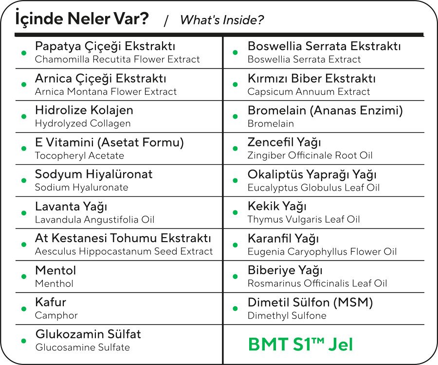 Aqua, Carbomer, Alcohol, Polysorbate 20, Cetearyl Alcohol, Chamomilla Recutita Flower Extract, Arnica Montana Flower Extract, Triethanolamine, Hydrolyzed Collagen, Tocopheryl Acetate, Phenoxyethanol, Sodium Hyaluronate, Lavandula Angustifolia Oil, Aesculus Hippocastanum Seed Extract, Menthol, Camphor, Boswellia Serrata Extract, Capsicum Annuum Extract, Bromelain, Zingiber Oicinale Root Oil, Eucalyptus Globulus Leaf Oil, Thymus Vulgaris Leaf Oil, Eugenia Caryophyllus Flower Oil, Rosmarinus Officinalis Leaf Oil, Ethylhexylglycerin, Dimethyl Sulfone, Glucosamine Sulfate.