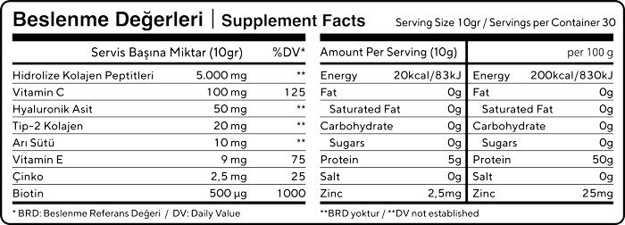 Hidrolize Kolajen Peptitleri (sığır) 5000mg, Kıvam Artırıcı (Maltodekstrin), Asitlik Düzenleyici (Sitrik Asit)(E330), İzomalt (E953), Doğal Mango Aroması, Vitamin C 100 mg (L-Askorbik Asit), Hyaluronik Asit 50mg, Vitamin E (DL-alfa-tokoferil asetat), Arı Sütü̈, Tip 2 Kolajen (Doğası Değiştirilmemiş̧ ), Çinko Glukonat (Çinko), Tatlandırıcı (Sukraloz)(E955), Renklendirici (Beta Karoten), D-Biotin.