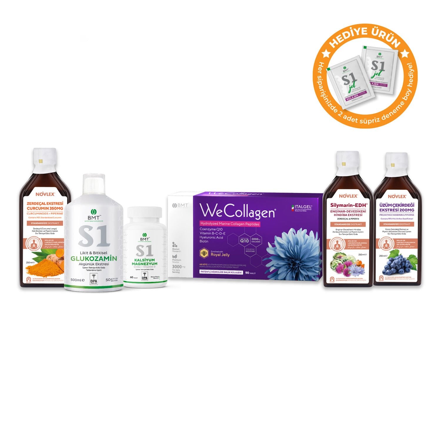 İçindekiler: Hidrolize Kolajen Peptitleri , Hacim Artırıcı (Mikrokristalin Selüloz), Hyaluronik Asit, L-Aksorbik Asit (Vitamin C), Arı Sütü, Polivinilpirolidon, Kollajen Tip 2 (Doğası Değiştiril[1]memiş), Çapraz Bağlı Sodyum Karboksi Metil Selüloz, Topaklanmayı Önleyici(Yağ Asitlerinin Magnezyum Tuzları), Çinko Sülfat, Vitamin E (DL-alfa-tokoferil asetat), Silikon Dioksit, Bakır Sülfat, Koenzim Q10, Vitamin D (Kolekalsiferol), Vitamin B5 (D-pantotenat, kalsiyum), D-Bi[1]otin, Vitamin B6 (Pridoksin hidroklorür), Sodyum Selenit.