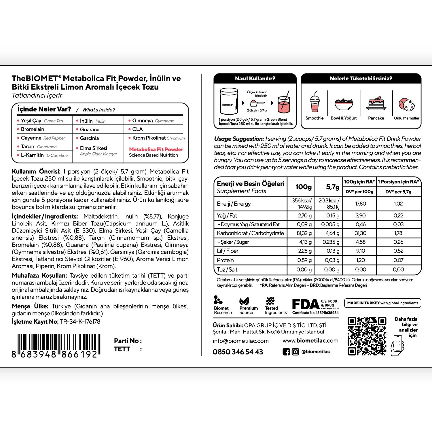 The BIOMET Metabolica Fit Powder, İnülin ve Bitki Ekstreli Limon Aromalı İçecek Tozu