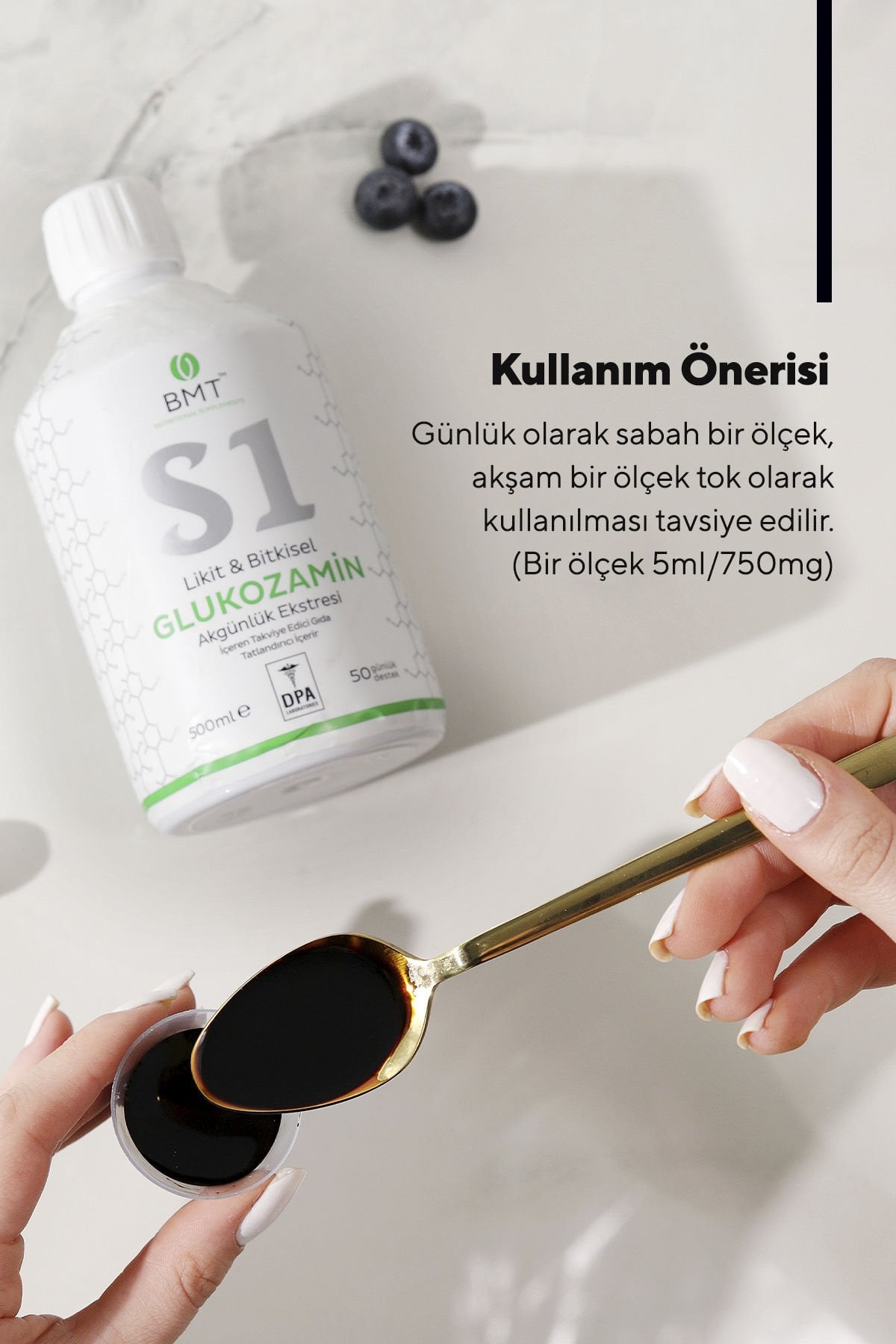 Günlük Alım Dozu ve Kullanım Önerisi: Günlük olarak sabah 1 ölçek, akşam 1 ölçek tok olarak kullanılması tavsiye edilir. (Bir ölçek 5 ml) Tavsiye edilen günlük porsiyonu aşmayınız.